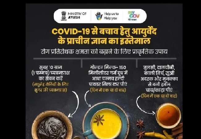 आयुष मंत्रालय की दिशा-निर्देश के हिसाब से आयुर्वेदिक उपायों से इम्युनिटी को बढ़ाने की बात कही गई है ना कि दवाओं के सेवन से। लोग तुलसी के पतों को काढ़ा बनाने के लिए इस्तेमाल कर सकते है और भारतीय मसाले का उपयोग जैसे कि दालचीनी, कालीमिर्च, हल्दी वाला दूध, लौंग, तेजपता इत्यादि। इन सबसे काढ़ा बनाकर पीने से लोगों की इम्युनिटी को कुछ हद तक बढ़ाया जा सकता है साथ ही विटामिन-सी के लिए ताजे मौसमी फल जैसे कि कीवी, मौसमी, नींबू, संतरा जैसे फलों का सेवन लाभदायक है।
