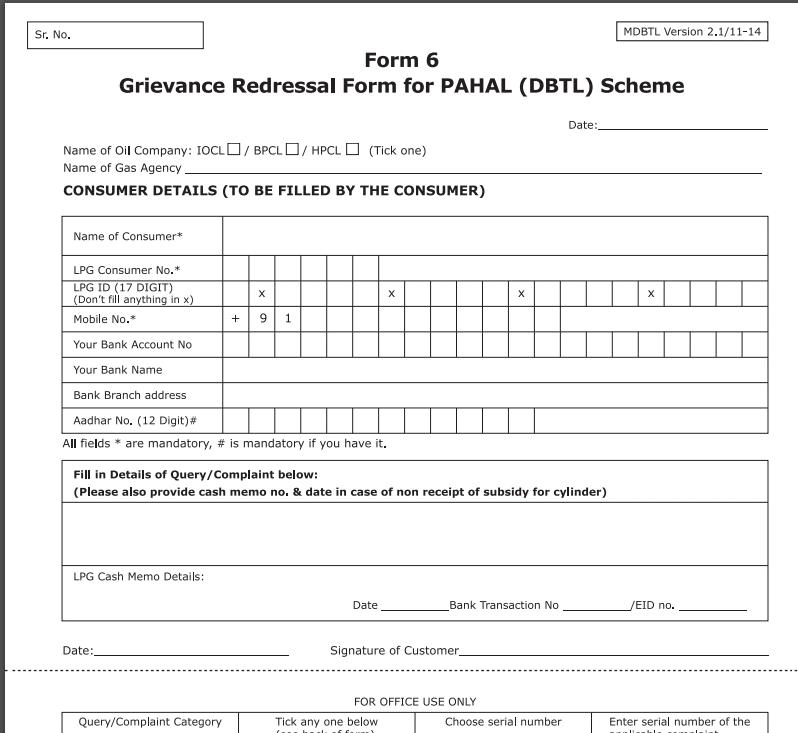 - शिकायतकर्ता उपभोक्ता फॉर्म 6 भरकर संबंधित एजेंसी (HP, Bharat, Indane) में प्रत्यक्ष लाभ हस्तांतरण (डीबीटीएल) से जुड़ी शिकायत कर सकता है।