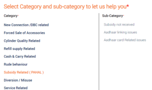 Step 4. उसके बाद आपके सामने एक नयी विंडो खुलेगी, जहां पर आपको कुछ कैटेगरी दिखाई देंगीं। उन सब श्रेणियों में से Subsidy Related (PAHAL) पर क्लिक करें। फिर सब-कैटेगरी में ‘Subsidy not Recevied’ पर क्लिक करें।