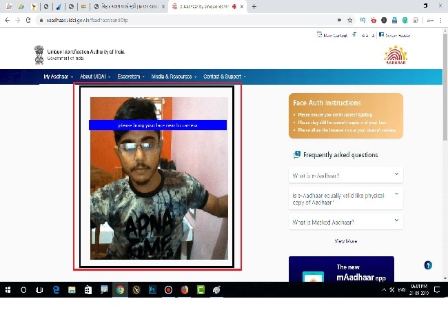 ■ अगर आप इस प्रोसेस को अपने मोबाइल में कर रहे हैं तो फिर face Auth ( face Aadhar card download ) पर क्लिक करते ही आपका फ्रंट कैमरा कार्य करना शुरू कर देगा , इसी प्रकार से अगर आप इस संपूर्ण प्रक्रिया को अपने लैपटॉप के माध्यम से कर रहे हैं तो लैपटॉप का कैमरा कार्य करना शुरू कर देगा और अगर डेक्सटॉप के जरिए आप इस प्रोसेस को कर रहे हैं तो आपको वेबकैम का प्रयोग करना होगा ।