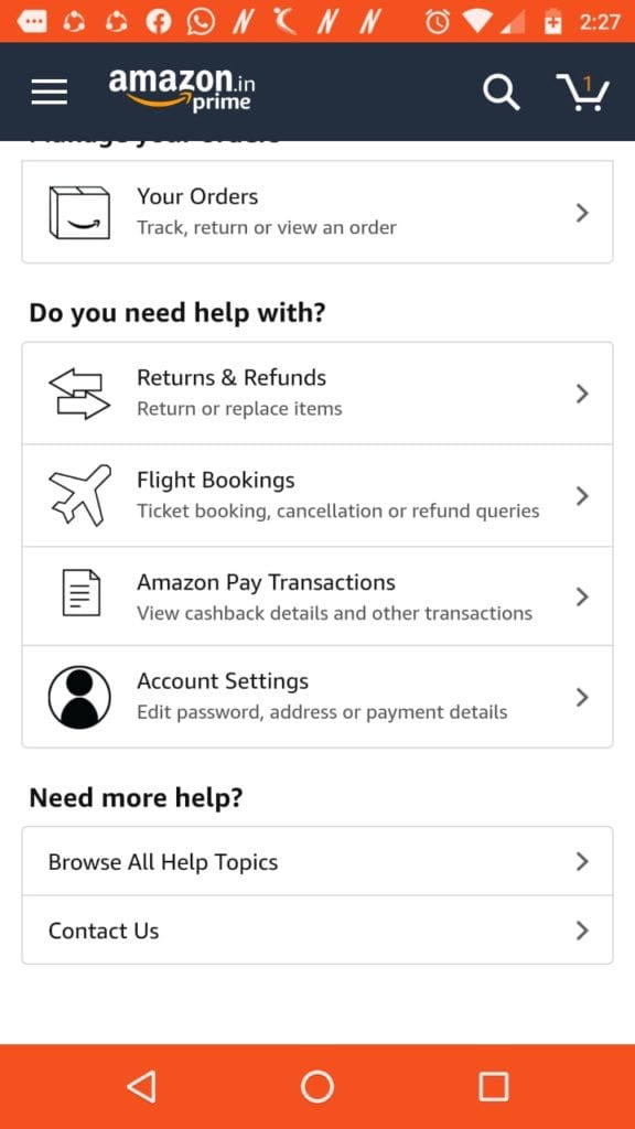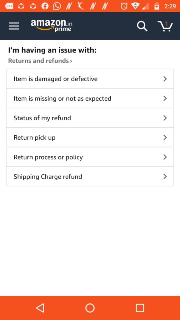 जिसके बाद आप अपनी समस्या के अनुसार ऑपशन का चयन कर सकते हैं। जैसे कि आपका मंगवाया हुआ सामान टूटा फूटा निकला है तो आप इसकी शिकायत अमेजन में करने के लिए return and refunds का ऑपशन चुन लें। इसके बाद आपके सामने बहुत से विकल्प आएंगे, जिनमें से दो ऑपशन इस प्रकार हैं-